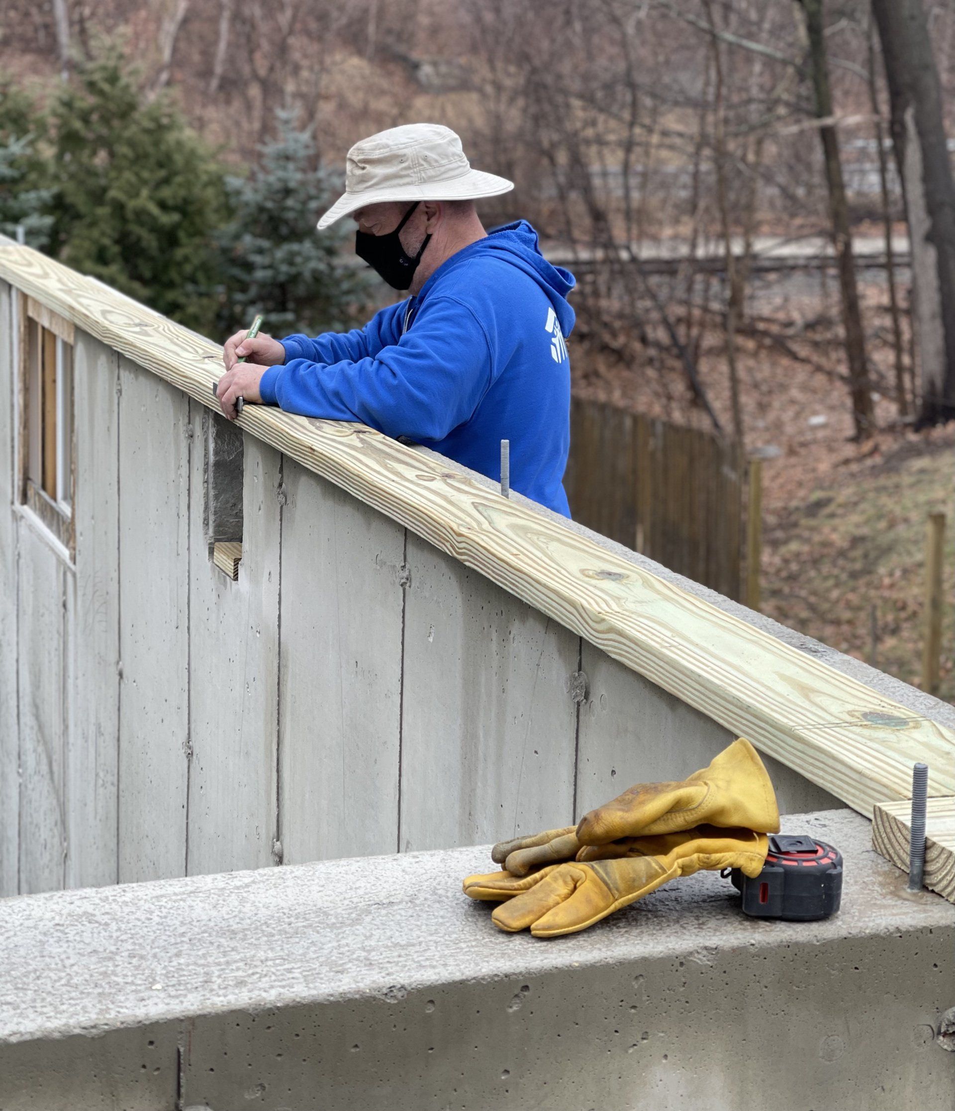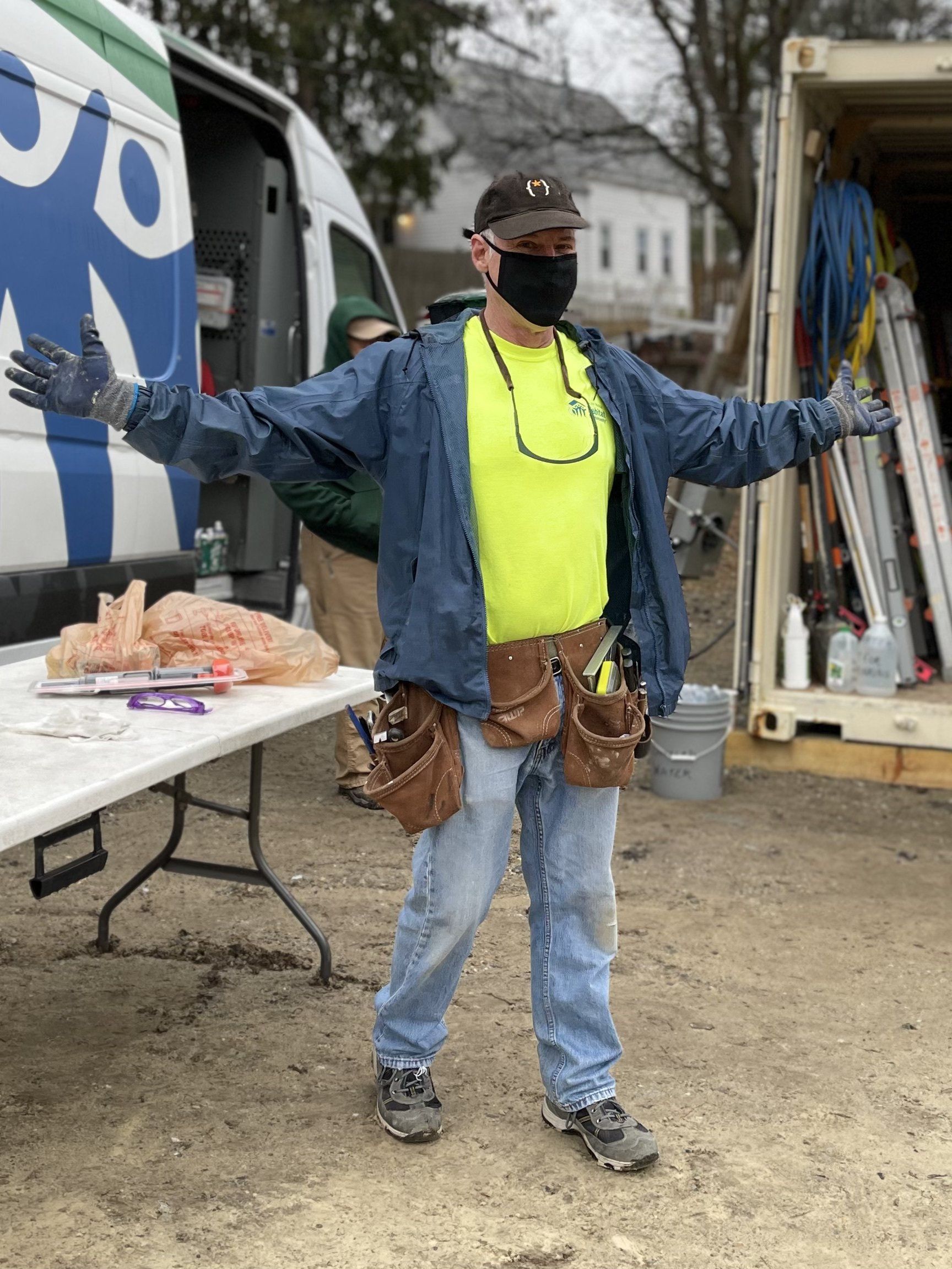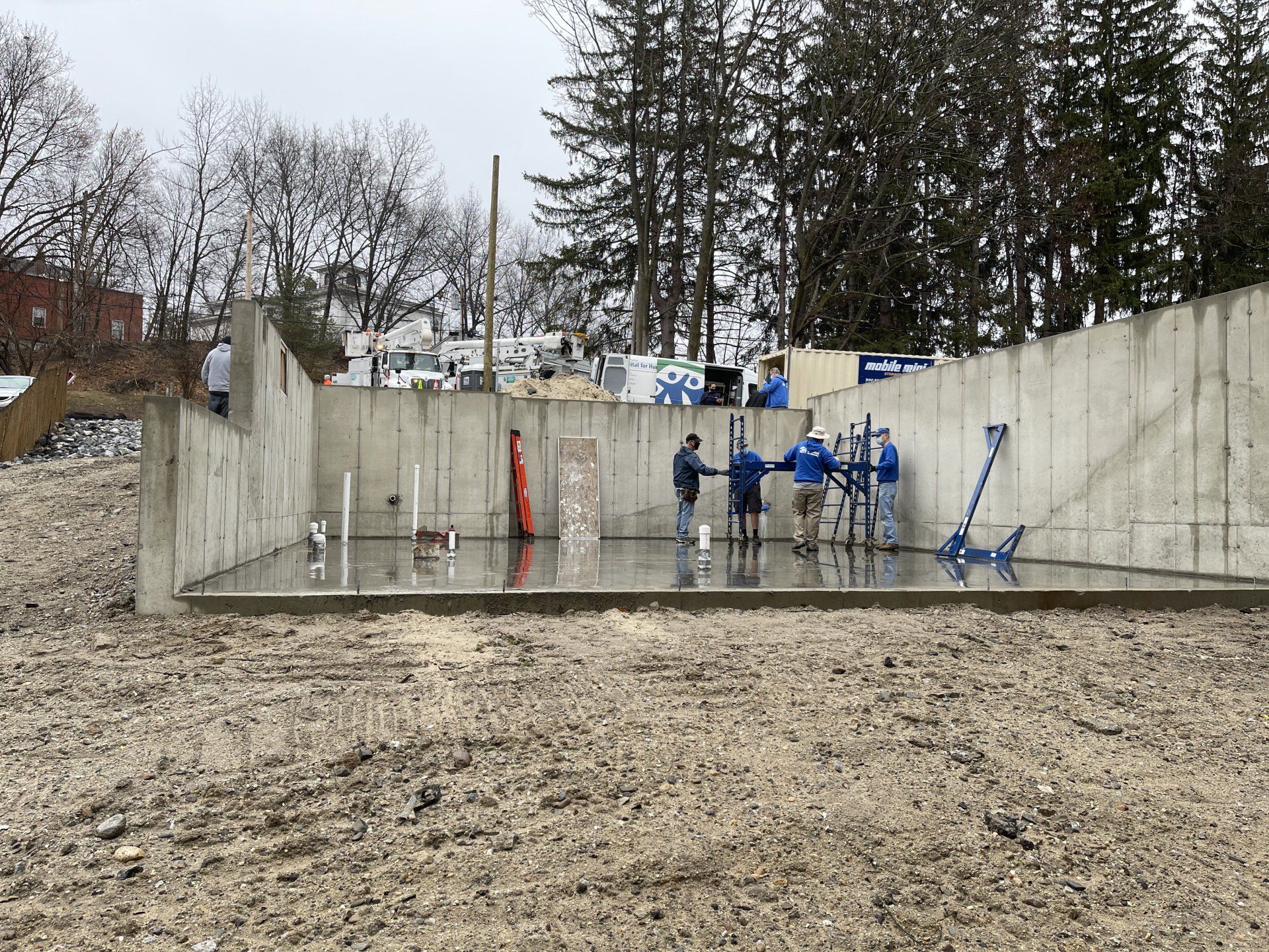 It was cool and rain was misting early on this morning of March 25th, 2021. Today was the beginning of the build phase for the two family veteran home dedicated to the memory of Roger Hall, former Core Build Member and one of the longest serving Volunteers in Greater Nashua Habitat's history since this affiliates establishment in 1994. Excavation on this property began close to a year ago and the foundation was poured last fall. The consequences of Covid-19 halted progress and the actual building of this home since Volunteer and build restrictions were placed by Habitat for Humanity International since last March.